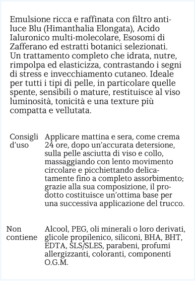 Aqua • Glyceryl Stearate SE • Rosa Centifolia Flower Water • Glycerin • Caprylic/Capric Triglyceride • Vitis Vinifera Seed Oil • Sodium Hyaluronate • Cetyl Alcohol • Himanthalia Elongata Extract • Isopropyl Myristate • Alaria Esculenta Extract • Narcissus Tazetta Bulb Extract • Sodium Hyaluronate Crosspolymer Pentylene Glycol • Crocus Sativus Callus Extracellular Vesicles • Ergothioneine Tricholoma Matsutake Mycelium Ferment Extract • Benzyl Alcohol Dehydroacetic Acid • Acetyl Octapeptide-3 Caprylyl Glycol • Hydroxyethyl cellulose • Parfum • Helianthus Annuus Seed Oil Rosmarinus Officinalis Leaf Extract
